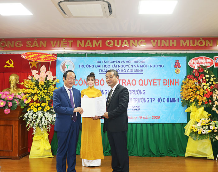 Phát biểu tại buổi lễ, thay mặt Lãnh đạo Bộ TN&MT, Thứ trưởng Võ Tuấn Nhân chúc mừng Nhà trường, chúc mừng PGS.TS. Huỳnh Quyền - Tân Hiệu trưởng Trường Đại học TN&MT TP.HCM. Trong bối cảnh hội nhập quốc tế sâu rộng, trong đó có giáo dục đại học cùng với yêu cầu cấp thiết trong việc đào tạo nguồn nhân lực ngành TN&MT chất lượng cao cho đất nước, Thứ trưởng Bộ TN&MT Võ Tuấn Nhân đề nghị Ban Giám hiệu Trường Đại học TN&MT TP.HCM cùng với tân Hiệu trường Nhà trường cần quan tâm, nỗ lực, phát huy năng lực của mình để thực hiện hoàn thành tốt các nhiệm vụ trọng tâm của Trường trong thời gian tới.
