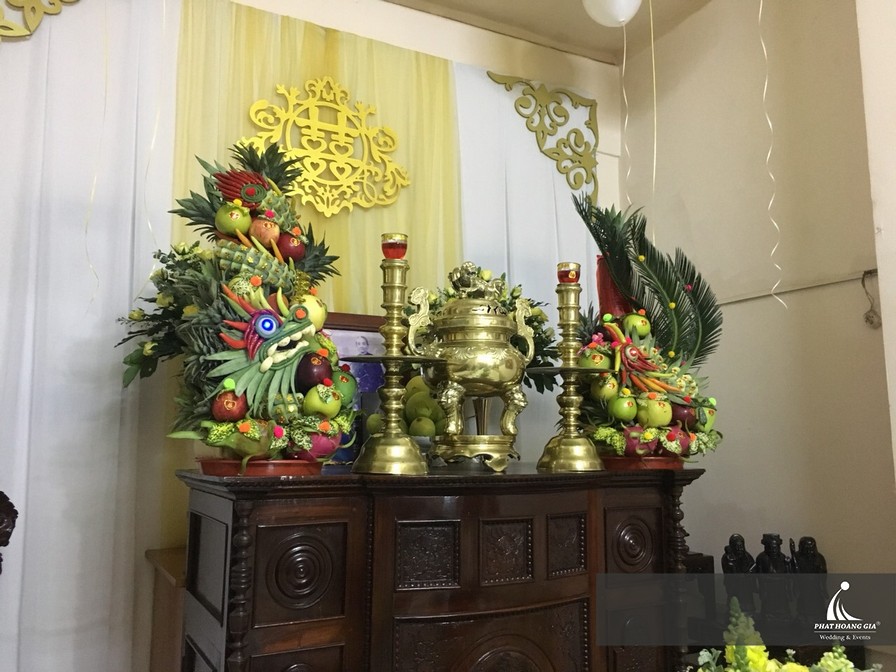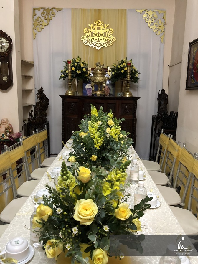 Không giới hạn trong phạm vi tiệc cưới trong nhà hàng mà hiện nay cô dâu chú rể cũng đem sắc vàng vào không gian buổi lễ gia tiên. Nét rực rỡ tươi vui của màu vàng chắc chắn sẽ giúp cho buổi lễ càng thêm phần long trọng và ý nghĩa.