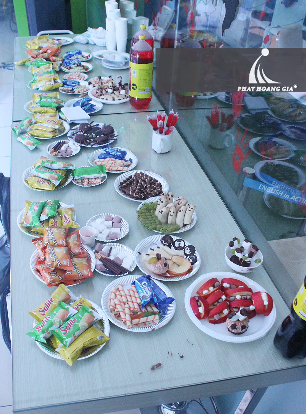 Ngoài ra để tăng thêm cảm giác huyền ảo thì với những dụng cụ đựng thức ăn bạn cũng có thể dán thêm những decal phát sáng để khi mọi người di chuyển trong không gian tối sẽ không bị va chạm và tạo cảm giác những chiếc đĩa đang lơ lửng vô cùng ma mị