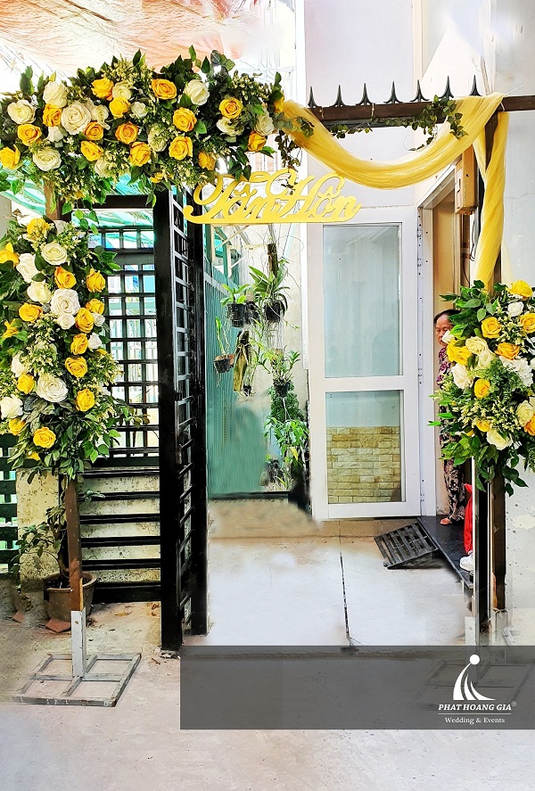 Sở hữu một bộ cánh nổi bật, hoa hồng vàng tượng trưng cho ánh sáng mặt trời, mang lại cảm giác ấm áp dễ chịu, cũng chính vì thế ý tưởng sử dụng hoa hồng vàng điểm trên nền xanh của lá cây xen kẻ với màu trắng tinh khôi của hồng bạch cho cổng hoa thể hiện sự chào đón nồng nhiệt của gia chủ đối với khách quan.